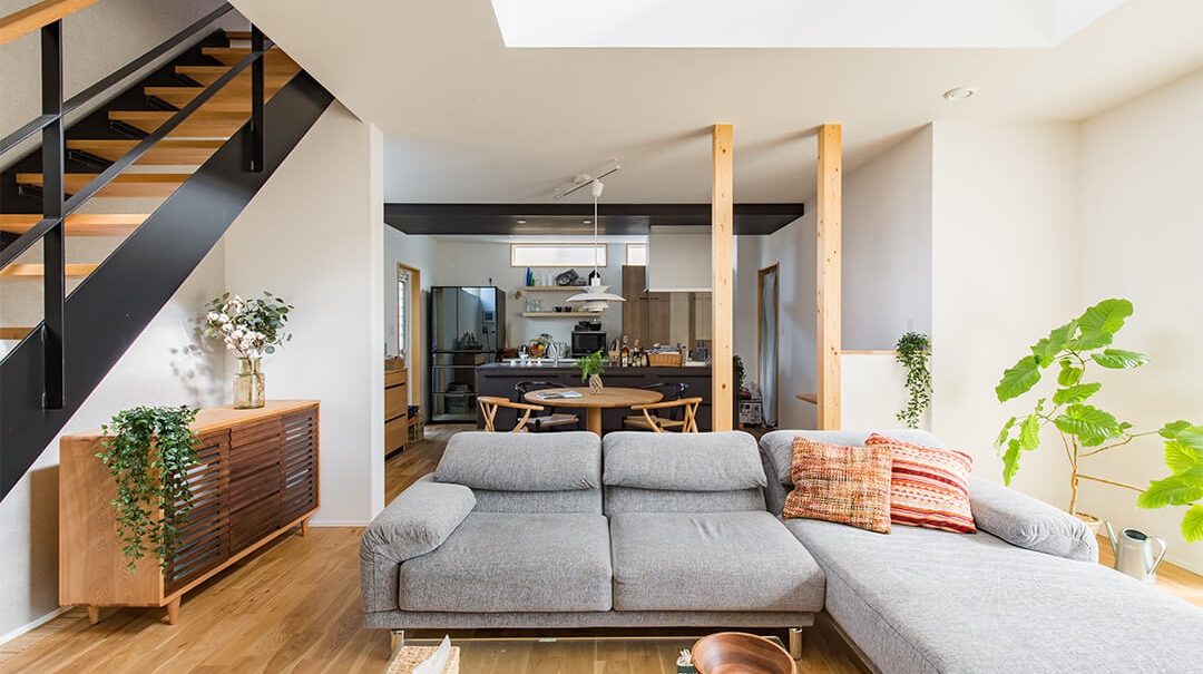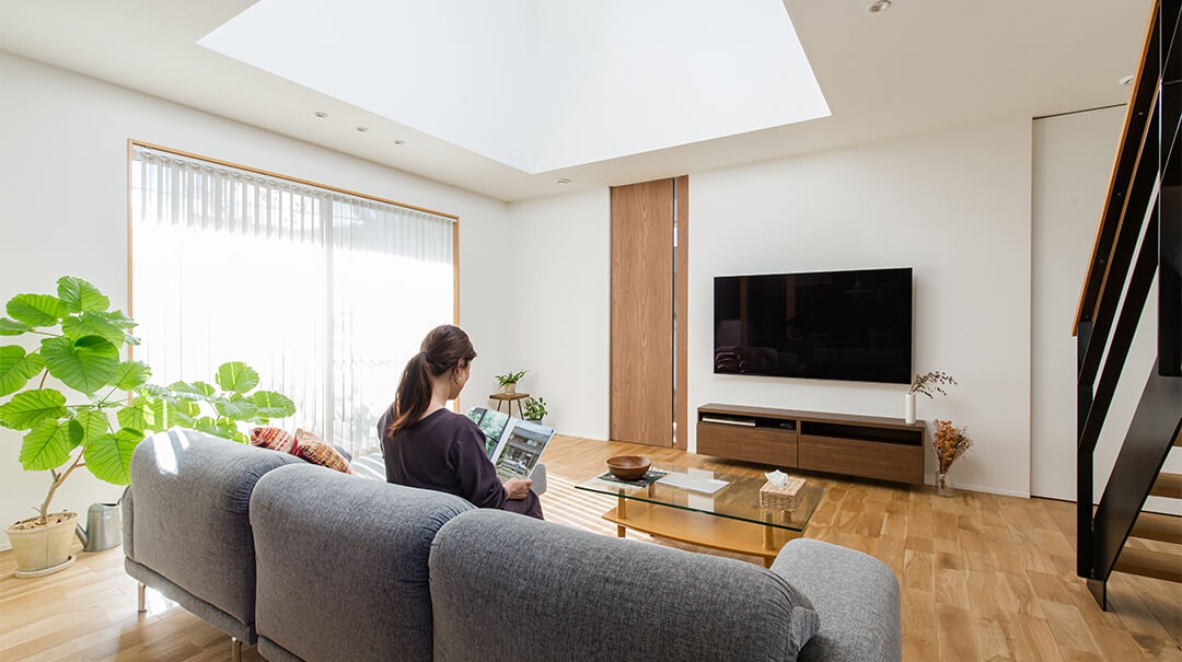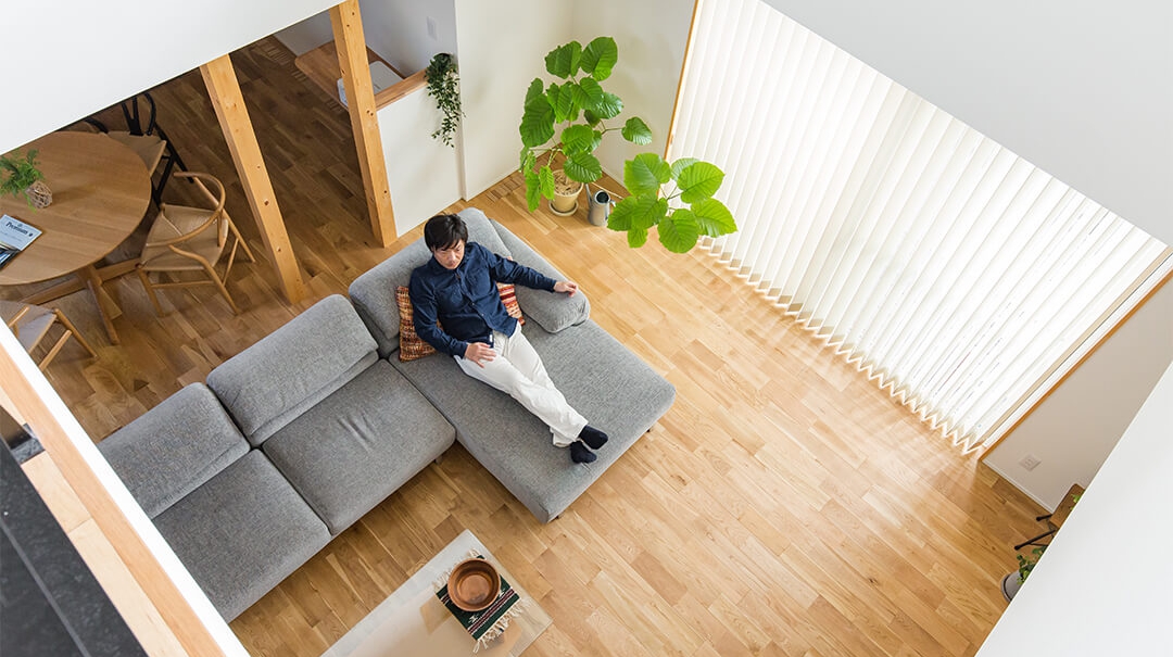 大きな吹き抜け空間は、ソファに座ってゆったりとするにはぴったりの空間。