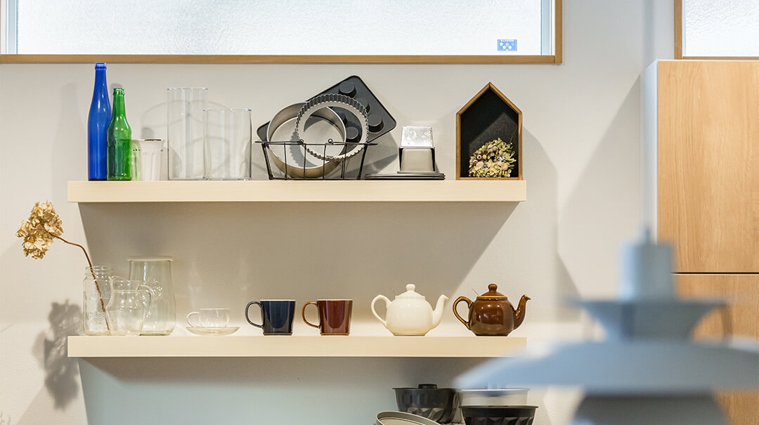 キッチンは料理やお菓子作りが好きな奥様のお気に入りのキッチン道具がレイアウトされており、