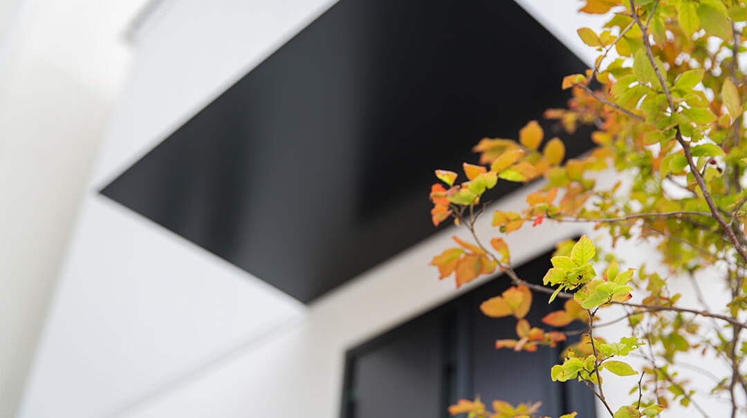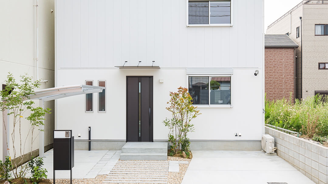 外観はシンプルなガルバリウム仕上げのデザイン、外構に少しのグリーンを挿し色にすることでシンプルながらまとまりのある設計で青空の良く似合うおうちに。